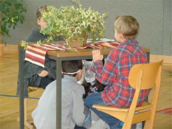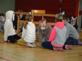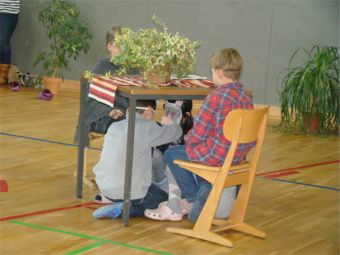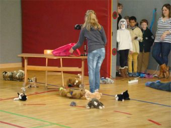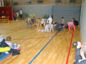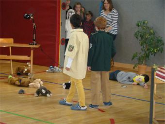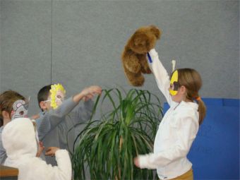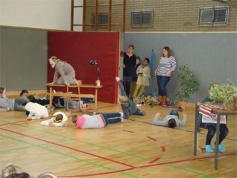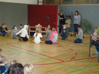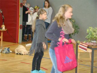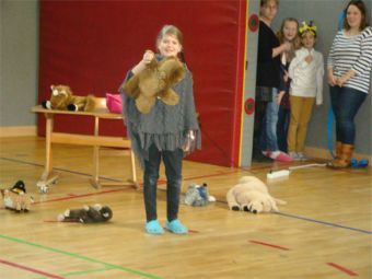 Am Dienstag, den 03.12.2013 spielte in der Turnhalle der Schule die Theater-AG unter Leitung von Leonie Hoogen das Spielstück „Alarm im Kinderzimmer“. In der Turnhalle hatten sich alle Kinder der Schule und die Kindergartengartenkinder des Kindergartens St. Nikolaus, Veen, versammelt. Dieses Stück handelt davon, dass Jennys Mutter in Jennys Zimmer einen alten zerfetzten Teddybär findet und diesen in den Müll wirft. Nachdem alle das Kinderzimmer verlassen haben erwachen die Kuscheltiere zum Leben und gehen auf die Suche nach Teddy. |