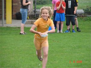 Ei auf einem Löffel. Bei einem dritten Spiel ging es um