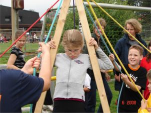 mussten. Ein Kind in einem hölzernen A sollte in Teamarbeit