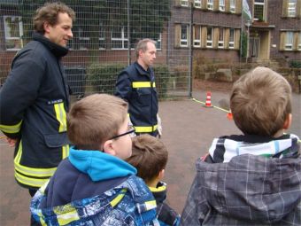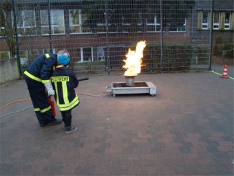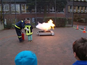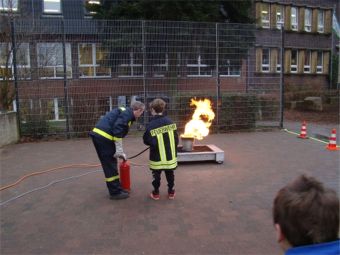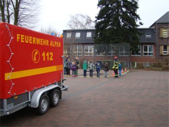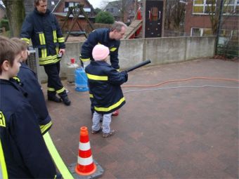An dieser Station ging es um das Löschen von Feuer. Die Kinder sollten erleben, wie sie selbst ein Feuer löschen können. Dazu hatten die Mitarbeiter der Freiwilligen Feuerwehr Alpen, Löschgruppe Veen, eindrucksvolles Gerät besorgt. Ein Gasbrenner konnte binnen Sekunden eine hohe Flamme erzeugen. Gelöscht wurde mit Druckluft und Wasser aus einem modernen Löschgerät, das alle Kinder bedienen konnten. Es standen auch Sand, Wasser und Löschdecken zur Verfügung. Natürlich gehörte auch die entsprechende Schutzkleidung dazu. Viele Kinder verfügten schon über Grundwissen im Umgang mit Feuer und kannten auch schon die Bedingungen, damit ein Feuer brennen kann. |