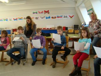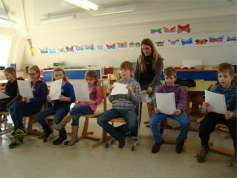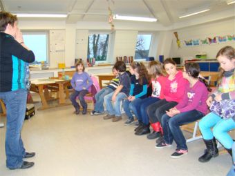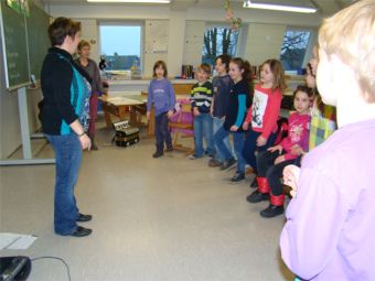 An dieser Station ging es um Spaß am Singen. Frau Roos und Frau van Bebber hatten sich lustige Lieder ausgesucht, die sie mit den Kindergruppen in kurzer Zeit lernen und singen konnten. Die Texte waren lustig, einprägsam und leicht zu lernen. Es wurden nicht nur die Stimmbänder, sondern auch der ganze Körper mit eingesetzt. Die Kinder genossen diese Station sehr.
