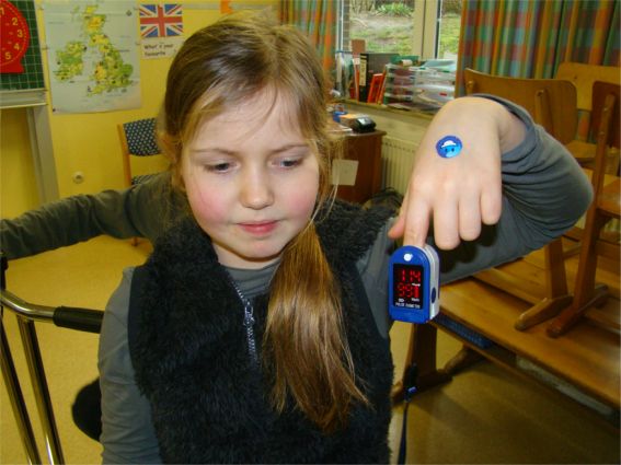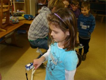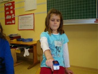 An dieser Station ging es um die Wirkung von körperlicher Bewegung morgens vor der Schule. Lernen ist dann besonders erfolgreich, wenn der Puls sich vorher schon einmal ordentlich nach oben bewegt hat. Unser Gehirn braucht Sauerstoff und Energie – körperliche Bewegung lässt mehr Blut mit Sauerstoff und Energie ins Gehirn kommen und regt die geistige Aktivität an – so ist die Theorie. Dieter Schneider ließ die Kinder die Pulsfrequenz messen, verordnete dann Bewegung auf den Treppenstufen, durch Kniebeugen oder auf dem Ergometer. Danach zeigte das Pulsmessgerät höhere Werte an. Die Kinder strengten sich gerne an – das Ergometer hatte an diesem Vormittag keine Pause. Wünschenswert wäre, dass möglichst viele Kinder zur Schule laufen oder mit dem Fahrrad fahren. |