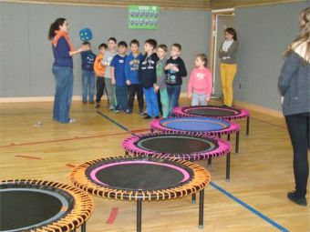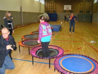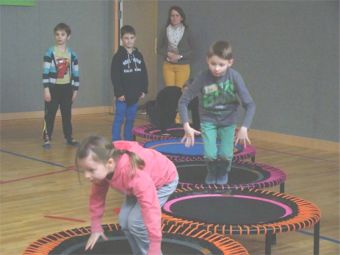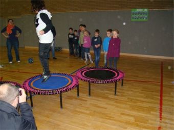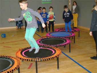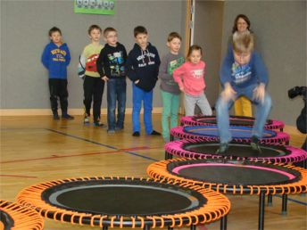 An dieser Station ging es um vielfältige Übungen auf dem Trampolin. Das Minitrampolin gehört seit einem halben Jahr fest in den Lehrplan unserer Schule. Die Kinder aller Klassen haben schon einige Trainingsstunden absolviert und kennen die Regeln im Umgang mit dem Sportgerät. Es wird in der Turnhalle im Sportunterricht eingesetzt, dient aber auch für den Einsatz in Bewegungspausen während des Unterrichts in der Klasse. Bekannte Übungen wurden an dieser Station wiederholt aber auch in Partnerarbeit Karteikarten mit Übungsvorschlägen eingesetzt. Alle Kinder lieben die Bewegung an den Minitrampolinen. |