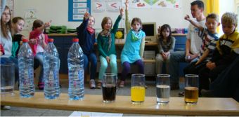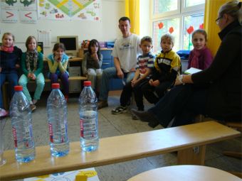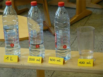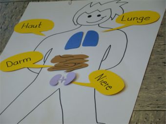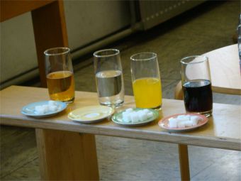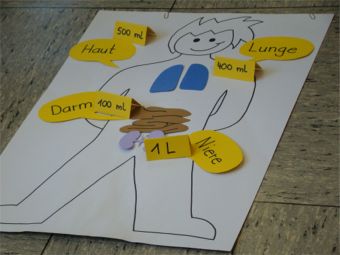 Wieso bekommen wir Durst? Jeden Tag scheiden wir sehr viel Wasser aus. Das passiert über die Lunge beim Atmen, über die Haut beim Schwitzen und über die Niere und dem Darm bei unseren Toilettengängen. Nachdem wir Flaschen mit den Ausscheidungsmengen Wasser den entsprechenden Organen zugeordnet haben, konnten wir sehen, wie viel Wasser wir wirklich jeden Tag verlieren. Fast 2 Liter müssen wir jeden Tag ausgleichen. Trinken ist somit sehr wichtig. Unser Körper meldet uns, wenn wir Durst haben. Wenn wir allerdings zu wenig trinken, werden wir schnell müde und wir können uns nur schwer konzentrieren. Manchmal wird der Mund trocken oder wir bekommen Kopfschmerzen. Aber wir müssen auch beachten, was wir trinken. Anhand von Tellern mit Zuckerwürfeln, die wir Gläsern mit Wasser, Apfelschorle, Cola und Fanta zugeordnet haben, erkannten wir, dass sich nicht jedes Getränk eignet um den Durst zu löschen und unseren Wassermangel auszugleichen. Übrigens: In 250 ml Cola und Fanta stecken jeweils 13 Zuckerwürfel. „Ihhh, das ist ja wirklich viel!“, mussten einige von uns erschreckend feststellen. Wenn ich Durst habe, trinke ich somit lieber Wasser oder verdünnte Säfte.