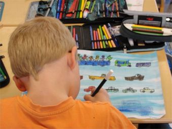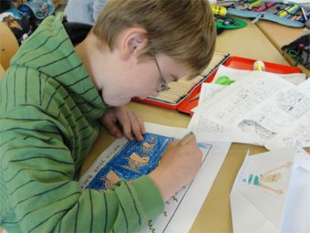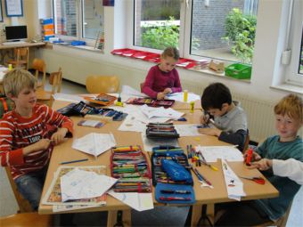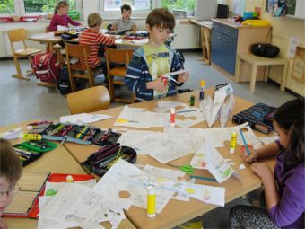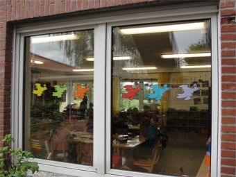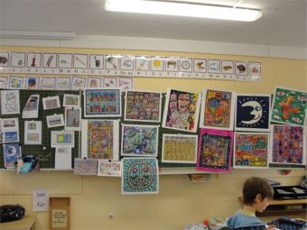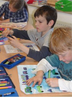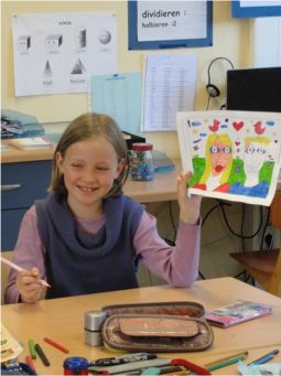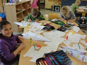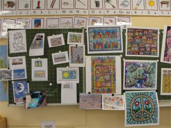Rizzi versuchte Malerei und Skulptur zu verbinden und entwickelte die für ihn typische 3-D-Grafik. Auch wir fertigten ein 3-D-Bild an mit lauter Rizzi-Autos. Das war ganz schön mühsam. Neben der Arbeit an seinen Bildern bemalte er auch die verschiedensten Sachen wie Autos und Wände von Häusern. Sogar die Außenfläche eines Flugzeuges gestaltete er 1996 zum vierzigjährigen Bestehen der Fluggesellschaft. Auch wir bastelten Papierflieger und gestalteten sie nach Rizzi. 2008 erschienen bei der Deutschen Post vier Briefmarken, die Rizzi entworfen hat. Auch wir entwarfen Briefmarken und gestalteten sie u.a. mit fröhlichen Gesichtern. Unsere Klassenfenster schmückten wir mit dem typischen Rizzi-Vogel. |