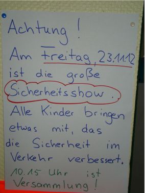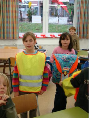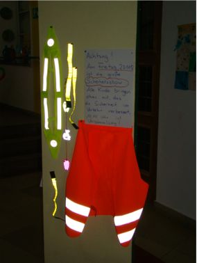 Im Herbst 2012 haben wir die Kinder in den Klassen und bei einigen Versammlungen auf die Gefahren für schlecht erkennbare Fußgänger im Straßenverkehr hingewiesen. |